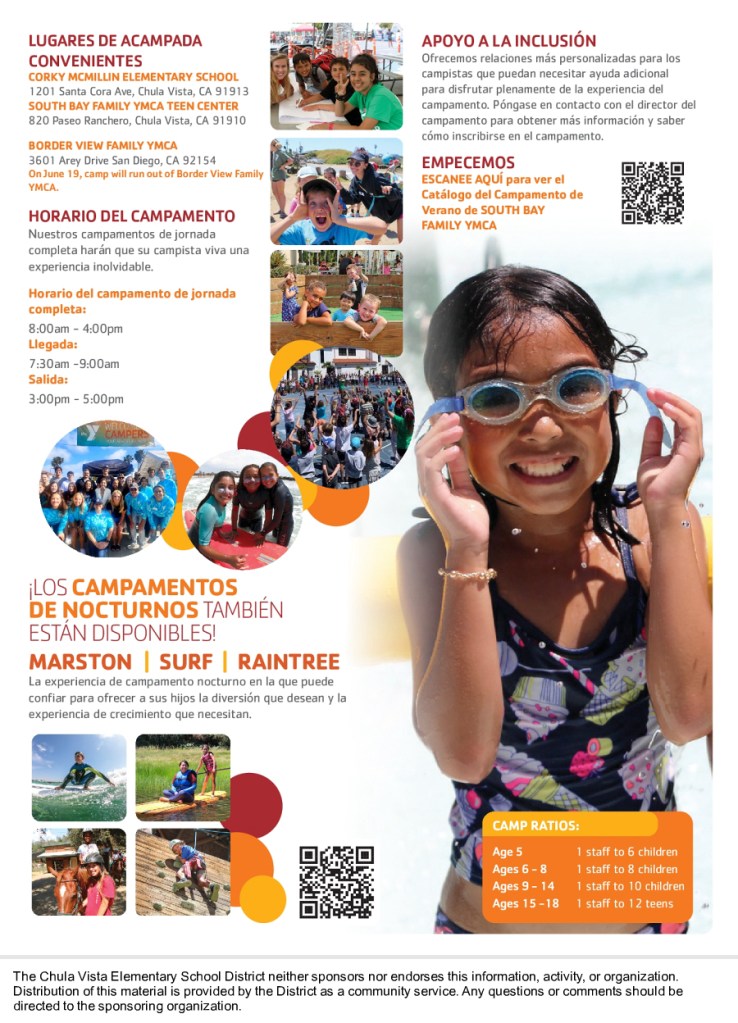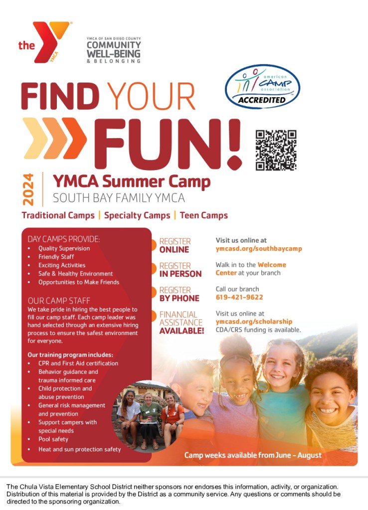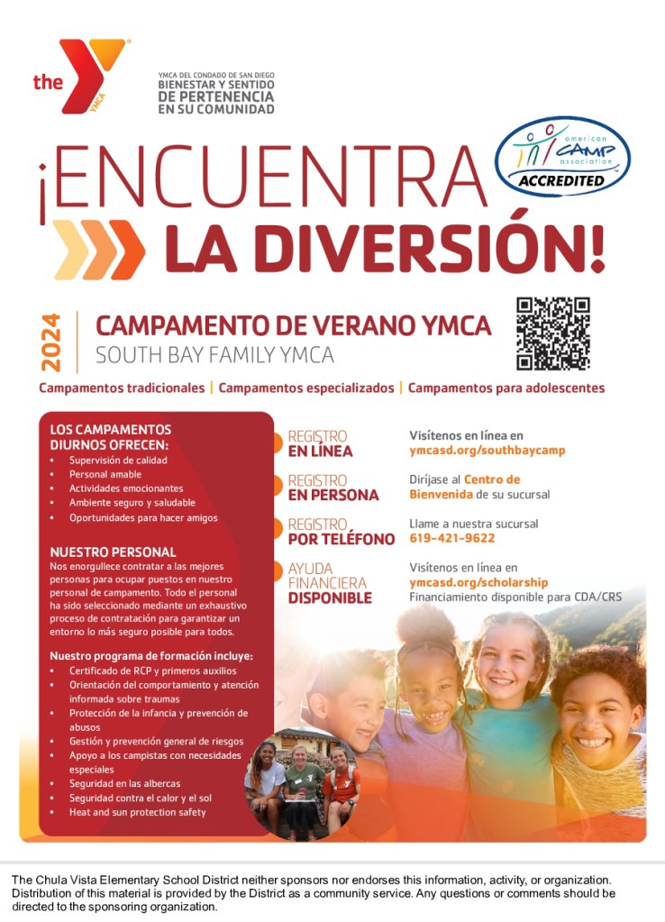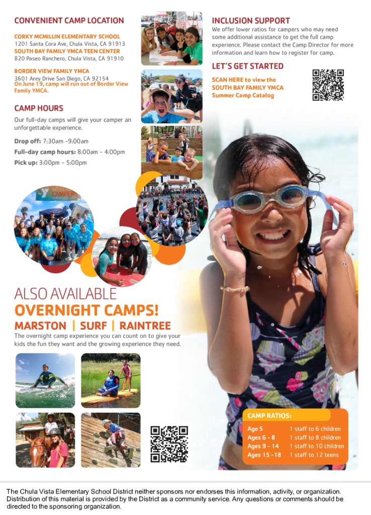 The Chula Vista Elementary School District provides this information as a community service. The South Bay Family YMCA offers an optional summer camp experience to families of CVESD for a nominal fee. More information is below: We encourage you to reach out directly to South Bay Family YMCA at (619) 421-9622 should you have additional questions.