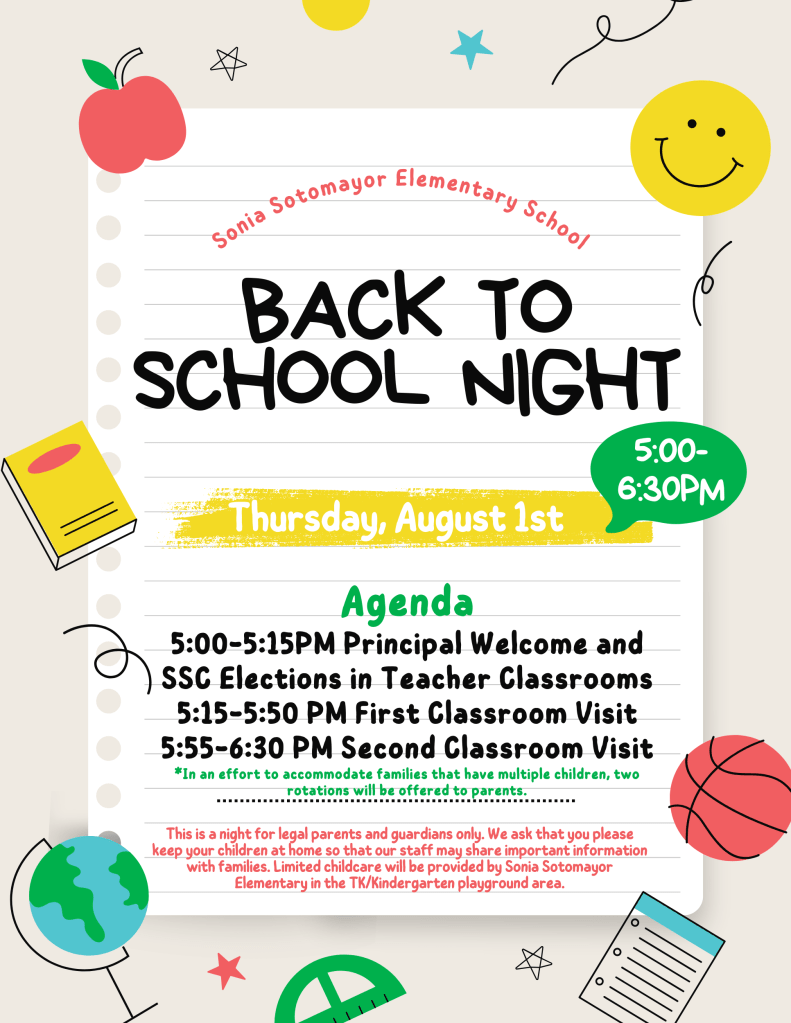 We will be having our Back to School Night on Thursday, August 1st from 5:00-6:30 PM where parents will get an opportunity to meet our Sotomayor staff, learn about grade level curriculum, daily routine and procedures, become a PTA member, and much more. This is a night for legal parents and guardians only. Please remember that this event is not meant to be a parent conference, it is designed to provide you with information about the class and answer general questions. We ask that you please keep your children at home so that our staff may share important information with families. Limited childcare will be provided by Sonia Sotomayor Elementary in the TK/Kindergarten playground area.