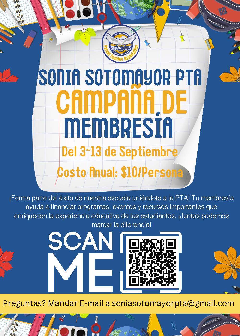 PTA Drive Membership starts TODAY! Lets come together as a Sotomayor community to reach our 175 membership goal. Your membership will fund important programs, events, and resources that enrich students’ educational experiences. Click on the link below or scan the QR Code located in the flyer below to join!