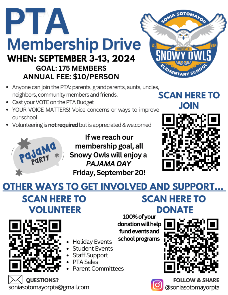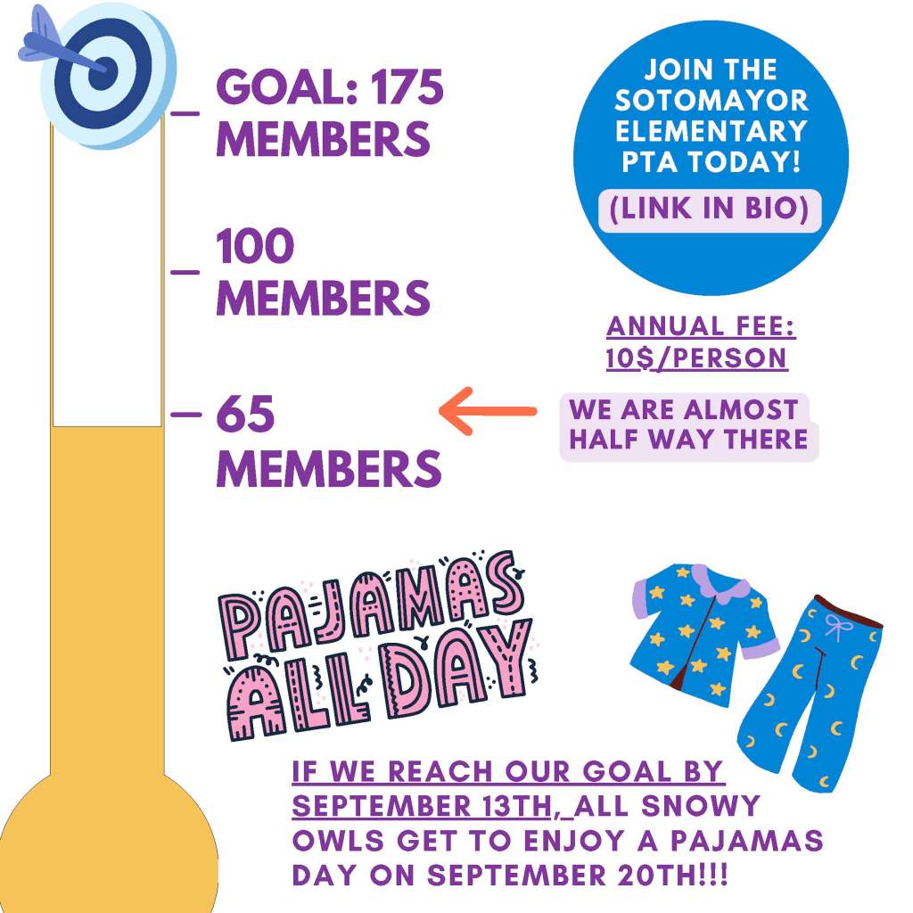 Our PTA Membership Drive is in full swing. We are currently at 64 members! Lets come together as a Sotomayor community and reach our goal of 175 to enjoy a Pajama Day on Friday, September 20th.