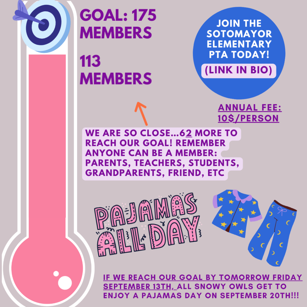 Remember that anyone can be a PTA member from parents, students, teachers, grandparents, and friends. All funding will be going right back to our school community to bring forth fun community events. Please click on the link below and help us reach our goal of 175 members!