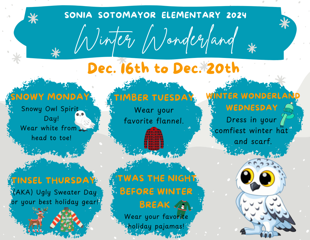 This week (Monday 12/16-Friday 12/20) we will have a Winter Wonderland Spirit Week at Sotomayor to get ready for the upcoming holidays!