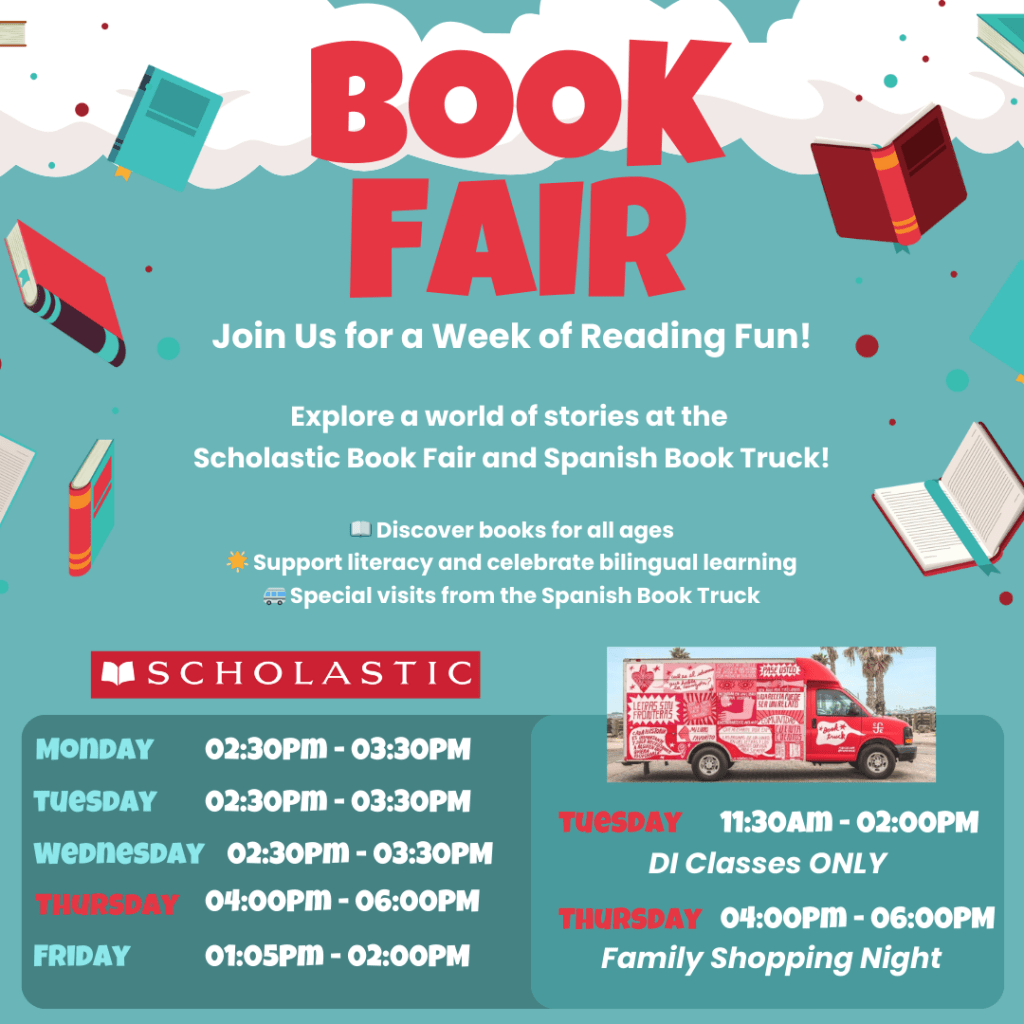 🛑 Note: For both the Scholastic Book Fair and the Spanish Book Truck, students must be accompanied by a parent or guardian to shop after school.