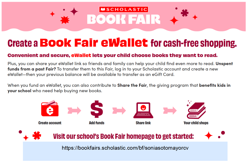 Students will be able to visit the book fair on Tuesday and Wednesday with their classes to check it out and create their wishlists. All sales will take place after school. Be sure to set up your eWallet now; it’s the easiest and safest way for your student to shop. See the information attached on how to set it up.