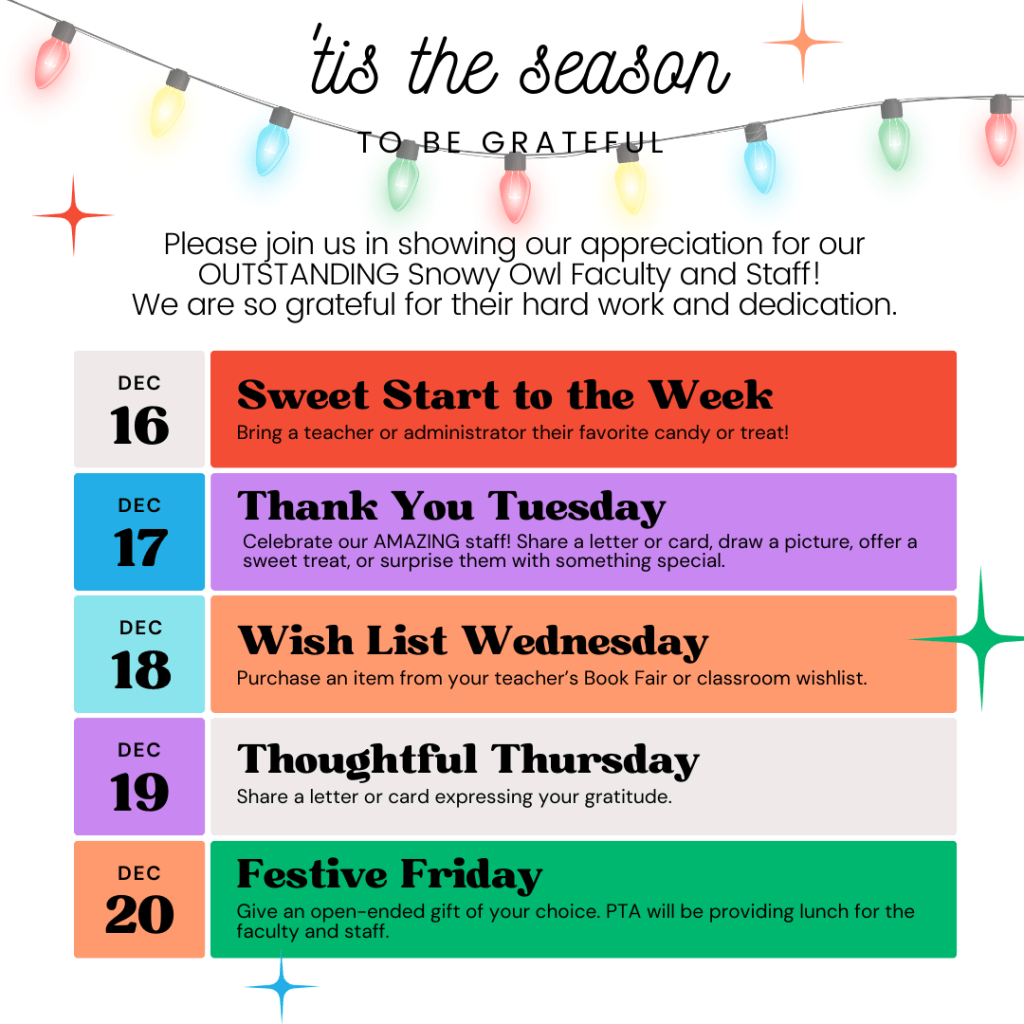 - Festive Friday: Give an open-ended gift of your choice. PTA will be providing lunch for the faculty and staff.