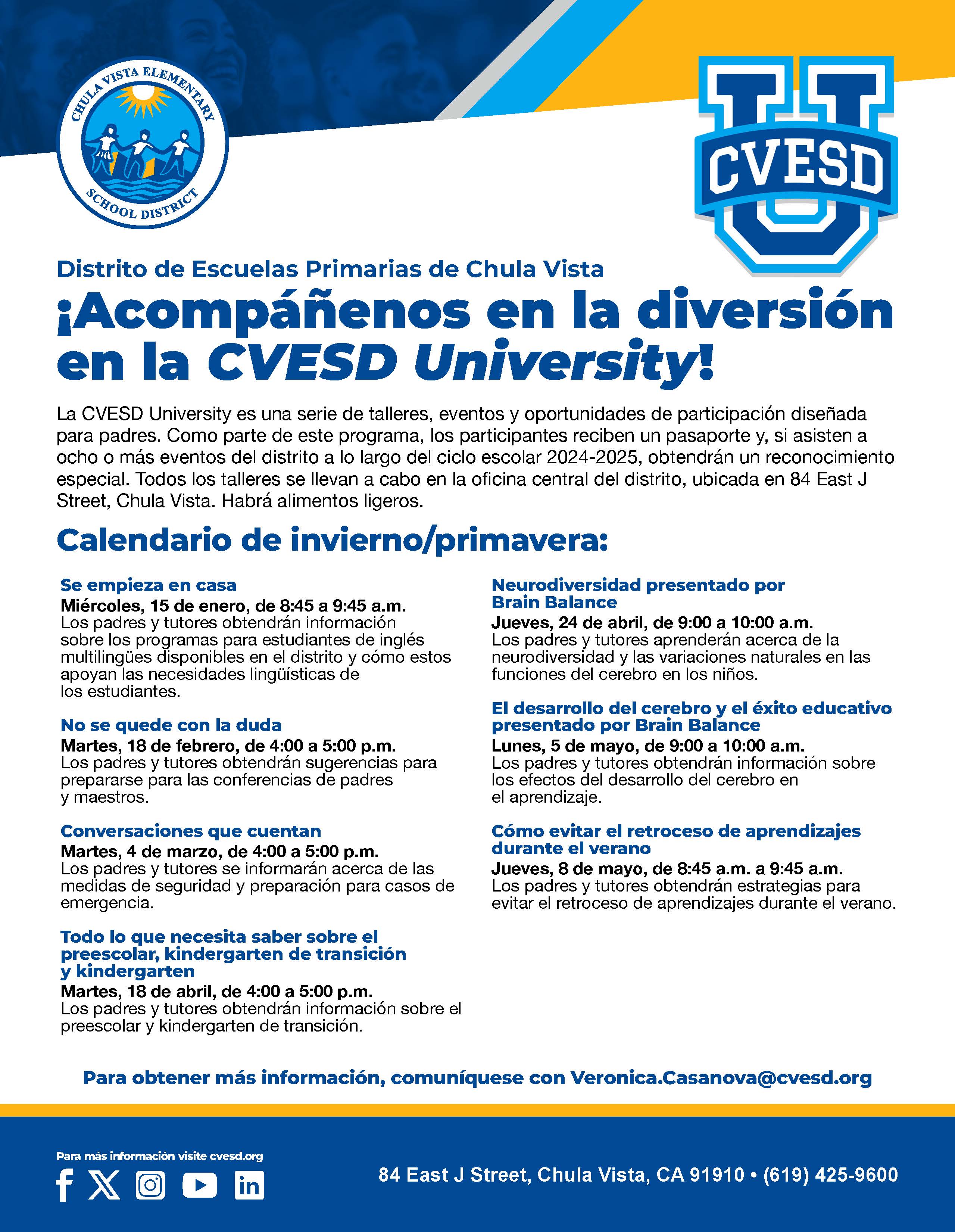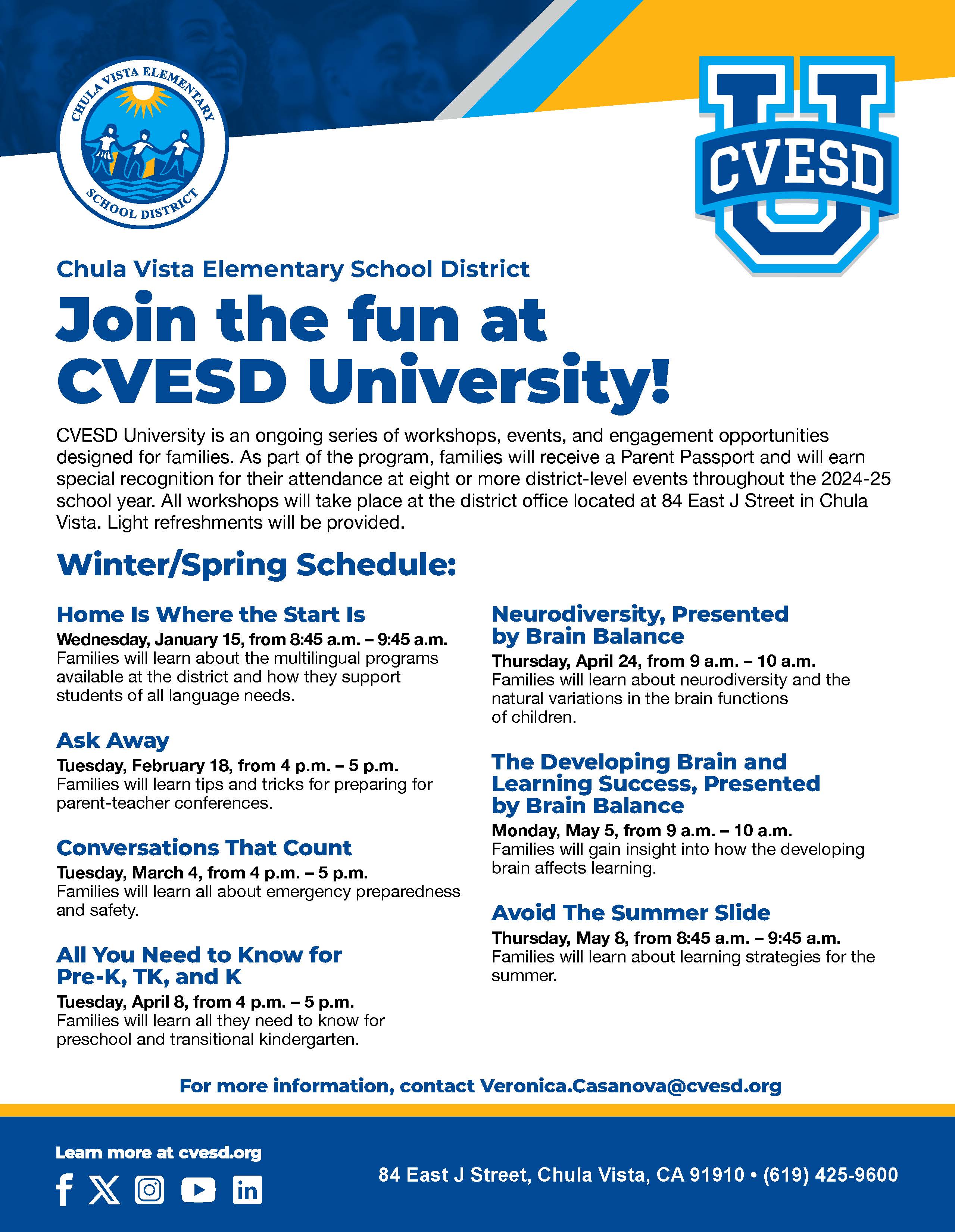 The current list of upcoming workshops can be found below. You can CLICK HERE for all of the upcoming information about CVESD University. This is an excellent way to become involved in your child’s education as well as learning more about the district.