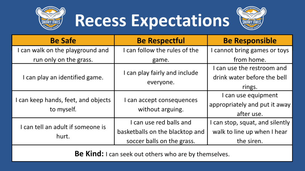 Our goal at Sonia Sotomayor Elementary School is to create and maintain a positive and safe learning environment for all and hold students accountable for being positive forces within our school community. The Snowy Owl Expectations are taught, modeled, and practiced throughout all grade levels and locations around campus. For the next two weeks, we will focus and reinforce the expected behaviors for recess. We appreciate your support in asking your Snowy Owls at home what specific behaviors allow them to be safe, respectful, responsible, and kind at recess.