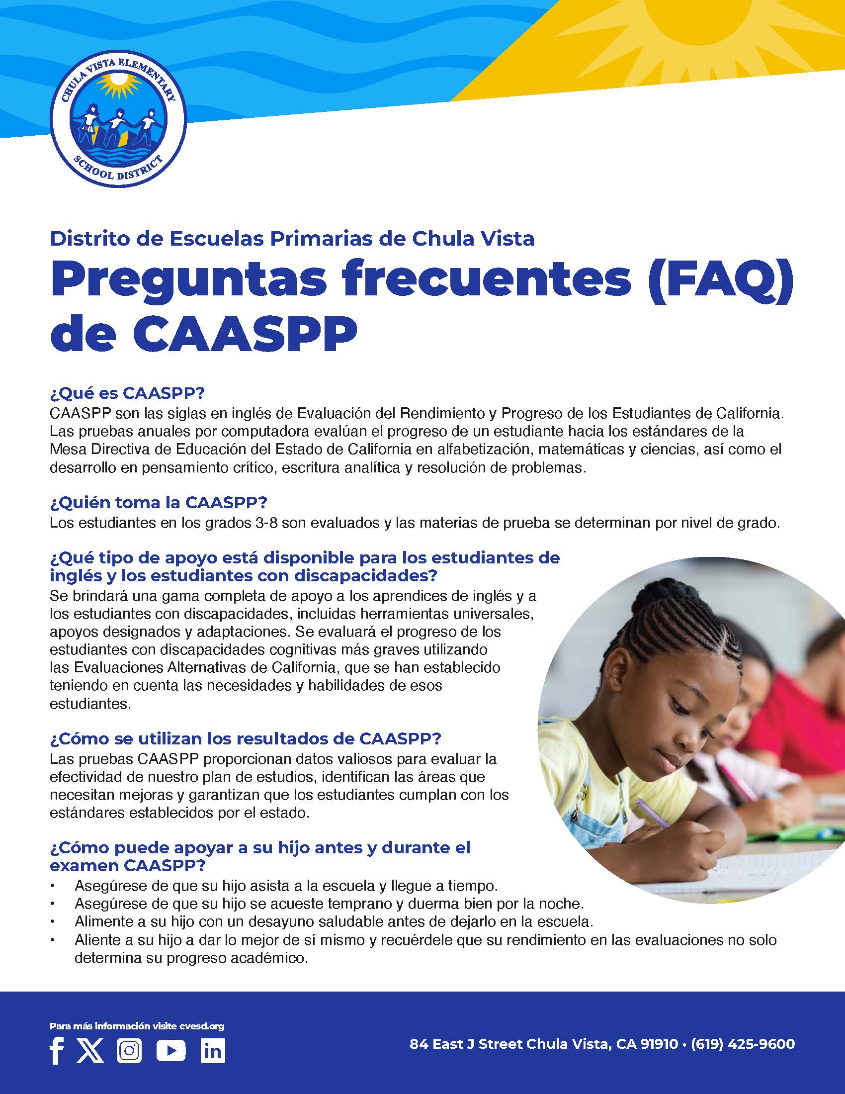 What is CAASPP Testing? Every year, California students take several statewide tests. When combined with other measures such as grades, class work, and teacher observations, these tests give families and teachers a more complete picture of their child’s learning. You can use the results to identify where your child is doing well and where they might need more support.