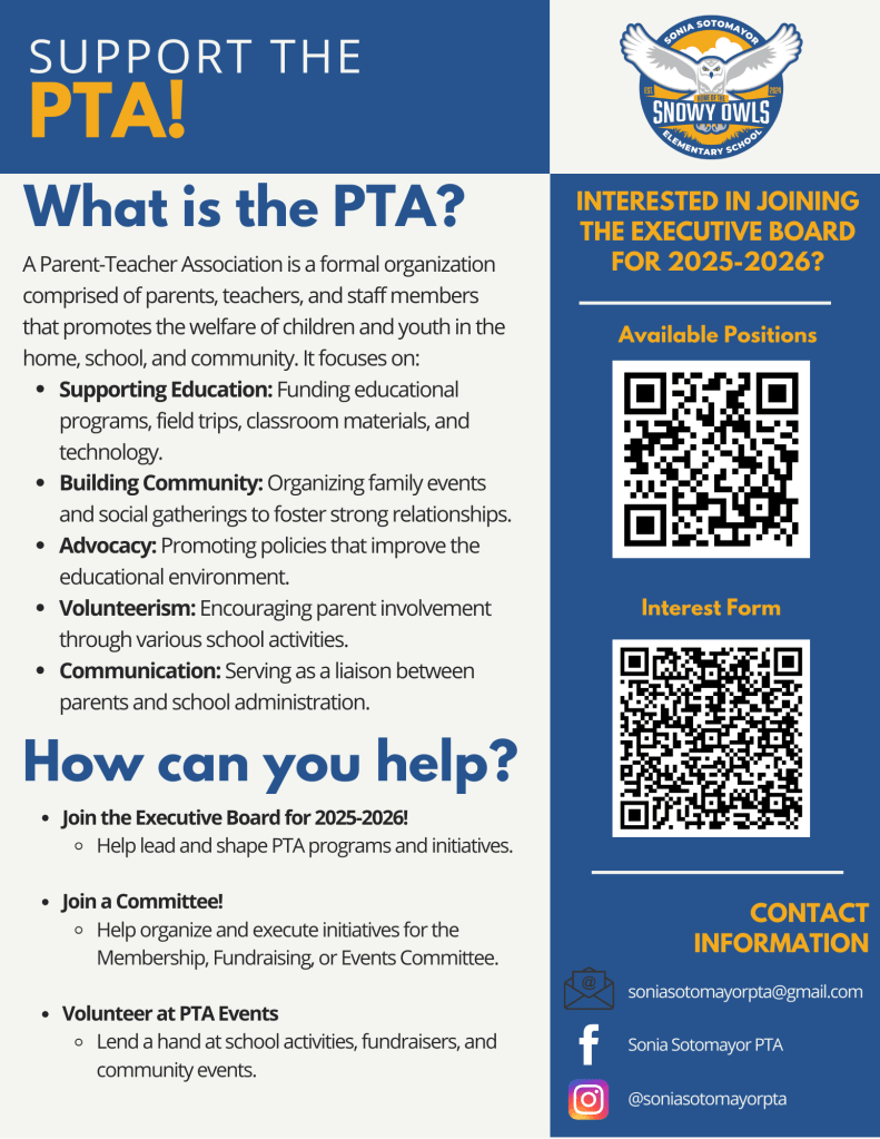 Interested? Reach out ASAP—our nominating report is due next weekend. You can email us (soniasotomayorpta@gmail.com), message us (here on Facebook or on Instagram), or complete this interest survey: https://forms.gle/ppRudDobdy51PDYQ6.