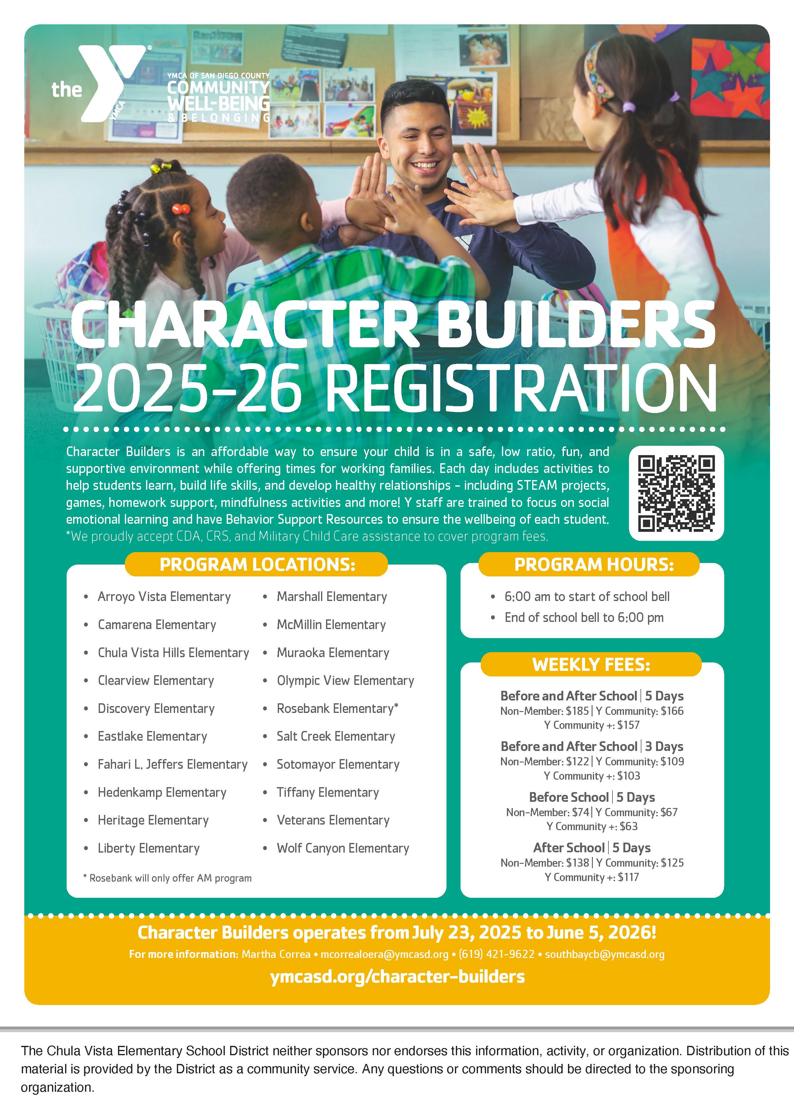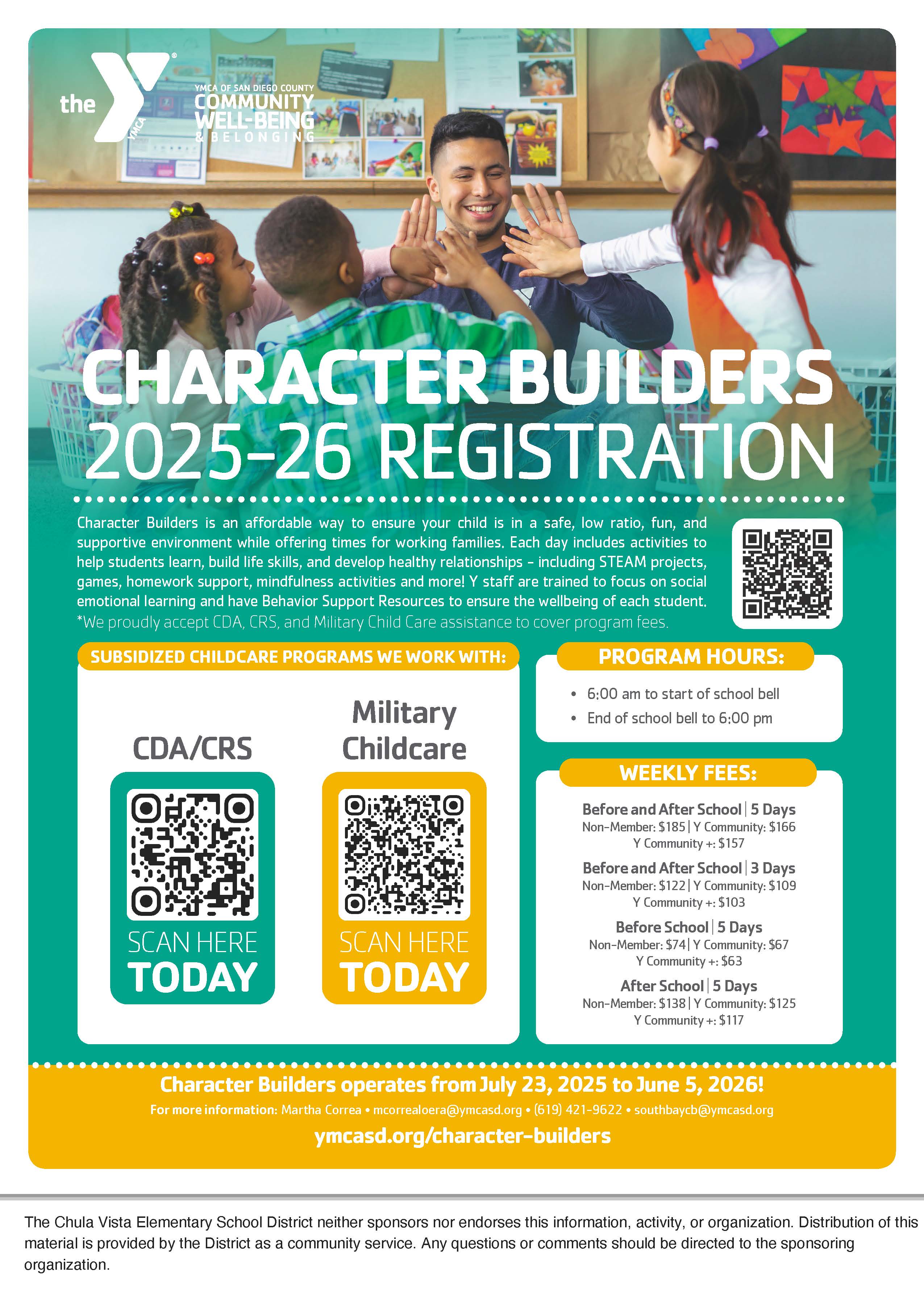 We’re excited to share that Character Builder registration is now open for the 2025–2026 school year! Character Builders is an affordable way to ensure your child is in a safe, low ratio, fun, and supportive environment while offering times for working families. Each day includes activities to help students learn, build life skills, and develop healthy relationships — including STEAM projects, games, homework support, mindfulness activities and more! Y staff are trained to focus on social emotional learning and have Behavior Support Resources to ensure the wellbeing of each student. Scholarships are available for families that qualify and they accept 3rd party Child Care Aware Fee for the Military.