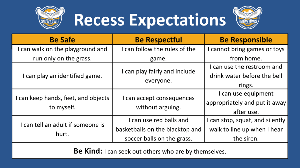 Our goal at Sonia Sotomayor Elementary School is to create and maintain a positive and safe learning environment for all and hold students accountable for being positive forces within our school community. The Snowy Owl Expectations are taught, modeled, and practiced throughout all grade levels and locations around campus. This week we will continue to focus and reinforce the expected behaviors for recess. We appreciate your support in asking your Snowy Owls at home what specific behaviors allow them to be safe, respectful, responsible, and kind during recess.