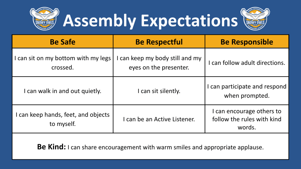 Our goal at Sonia Sotomayor Elementary School is to create and maintain a positive and safe learning environment for all and hold students accountable for being positive forces within our school community. The Snowy Owl Expectations are taught, modeled, and practiced throughout all grade levels and locations around campus. This week, we will continue to focus and reinforce the expected behaviors for assemblies. We appreciate your support in asking your Snowy Owls at home what specific behaviors allow them to be safe, respectful, responsible, and kind during assemblies.