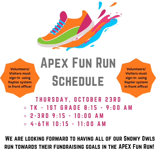 Thank you for everyone’s active participation as we launched into our annual Apex Fun Run which will occur this Thursday, October 23rd on our grass field. Our Snowy Owls are excited about the leadership lessons in their classroom each day leading up to the event.