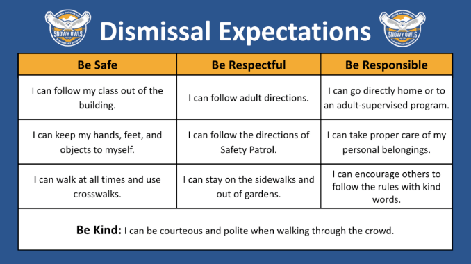 Our goal at Sonia Sotomayor Elementary School is to create and maintain a positive and safe learning environment for all and hold students accountable for being positive forces within our school community. The Snowy Owl Expectations are taught, modeled, and practiced throughout all grade levels and locations around campus. For the next week, we will continue to focus and reinforce the expected behaviors for dismissal. We appreciate your support in asking your Snowy Owls at home what specific behaviors allow them to be safe, respectful, responsible, and kind at dismissal.