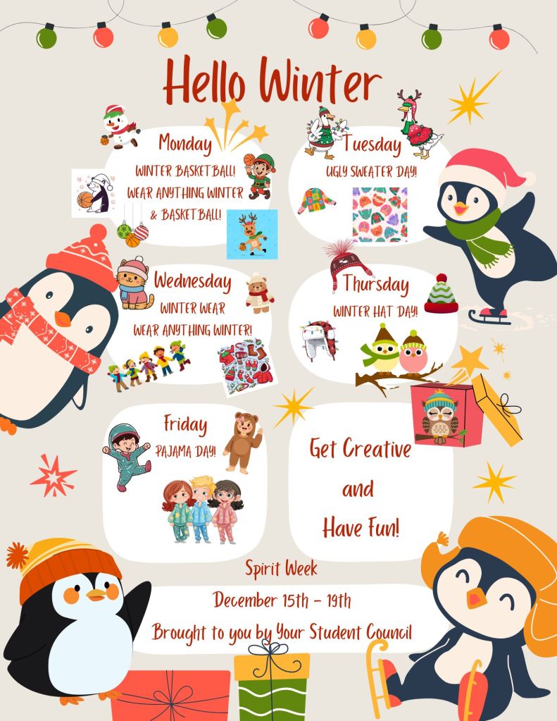 This week (Monday 12/15-Friday 12/19) we will have a Hello Winter Spirit Week at Sotomayor to get ready for the upcoming holidays!