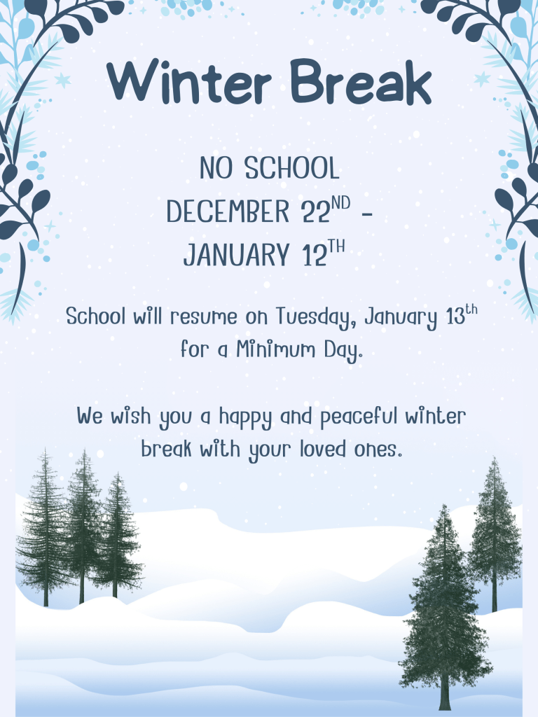 Winter Break will begin after this upcoming week of school! We hope you enjoy a safe and wonderful break with the people you love. Our office will also be closed during this time. School will resume for a Minimum Day on Tuesday, January 13th, 2026.