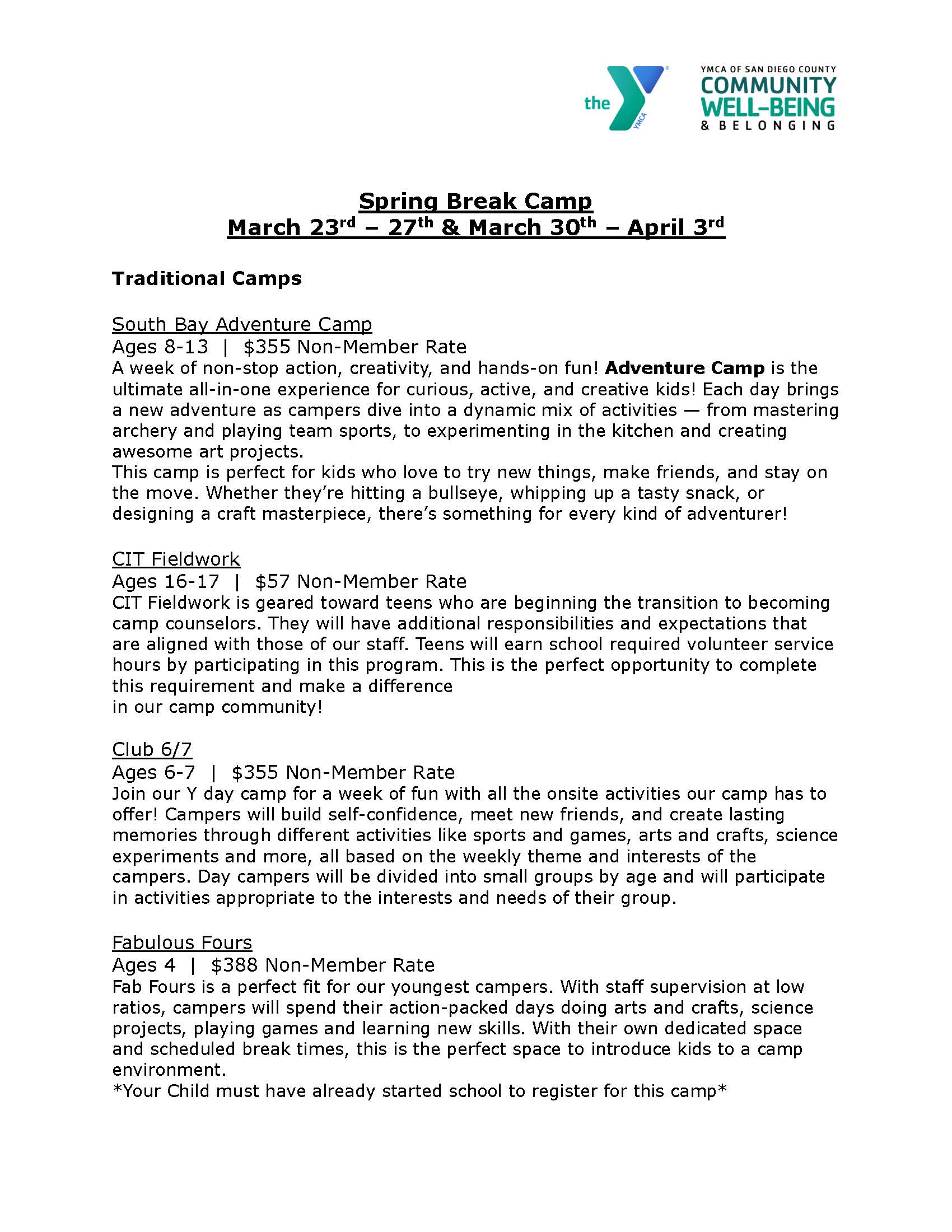Make spring break memorable with YMCA Spring Day Camp! Campers will enjoy a full week of arts and crafts, sports, games, and opportunities to make new friends in a safe, engaging environment.