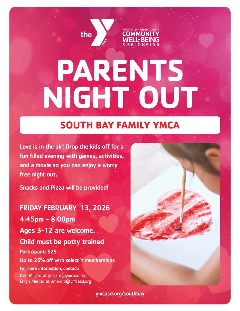 Looking for a worry-free evening? The South Bay Family YMCA is hosting a Parents’ Night Out where children ages 3–12 can enjoy a fun-filled night of games, activities, and a movie while parents enjoy time out.