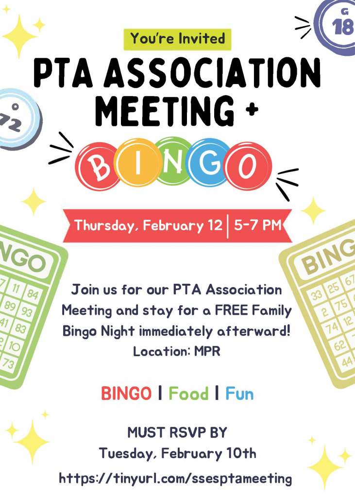 Next week, we will be holding our Quarterly PTA Association Meeting, followed by a BINGO Night for the community. This is an important meeting to update the budget and release funds for spring events. As a thank-you, anyone who attends the meeting will be automatically entered into a drawing for a $50 Sotomayor spirit wear gift card.