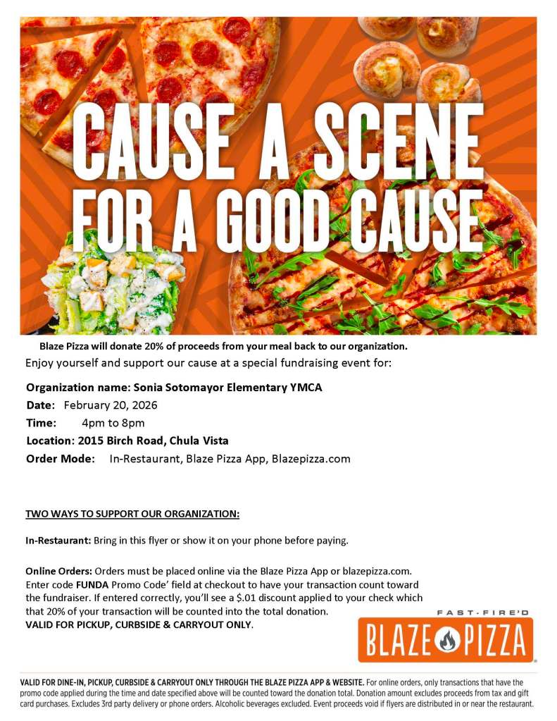 Join us for a delicious way to give back! Our school community is partnering with Blaze Pizza for a special fundraising night to support the Sonia Sotomayor Elementary YMCA.