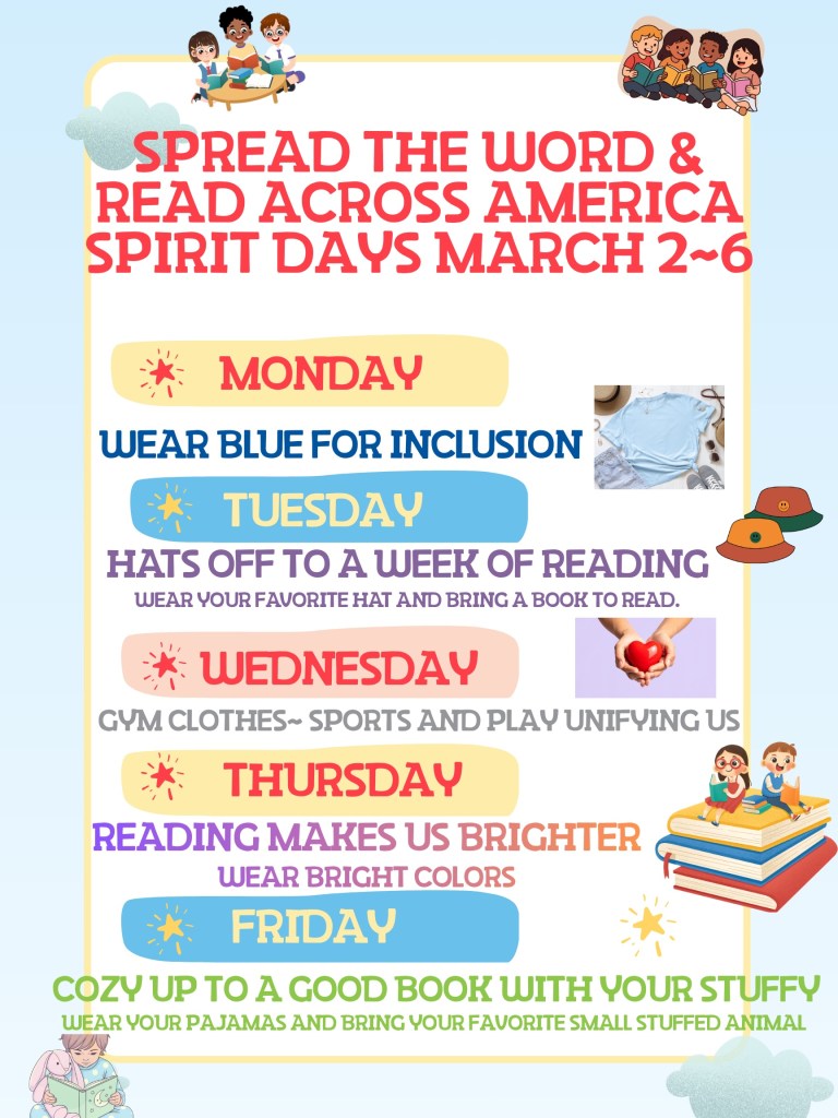 Below, you’ll find details about our fun spirit days. We look forward to seeing our students partake in our spirit days this week and sharing the joy of reading and kindness together!
