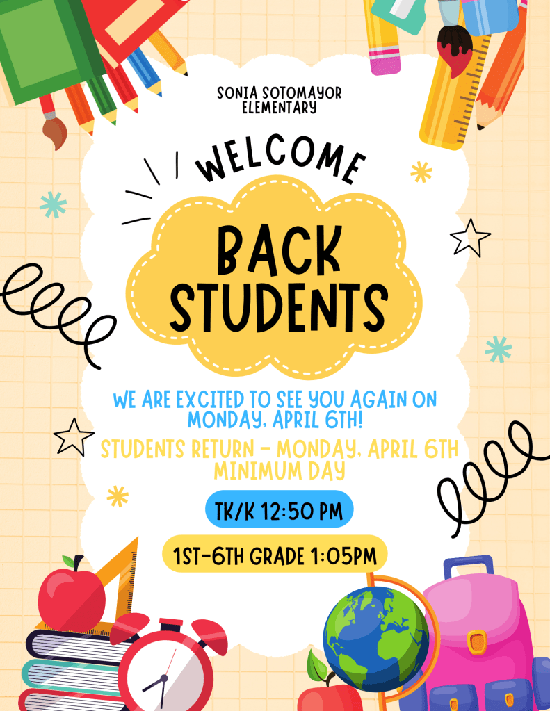 We hope everyone had a wonderful two weeks off and enjoyed the time with family and friends. Our staff has missed our Snowy Owls and look forward to having all our students return on Monday, April 6th. Please remember Monday, April 6th is a Minimum Day for all students, with our TK/Kindergarten students being dismissed at 12:50 PM and our 1st-6th grade students dismissed at 1:05 PM.