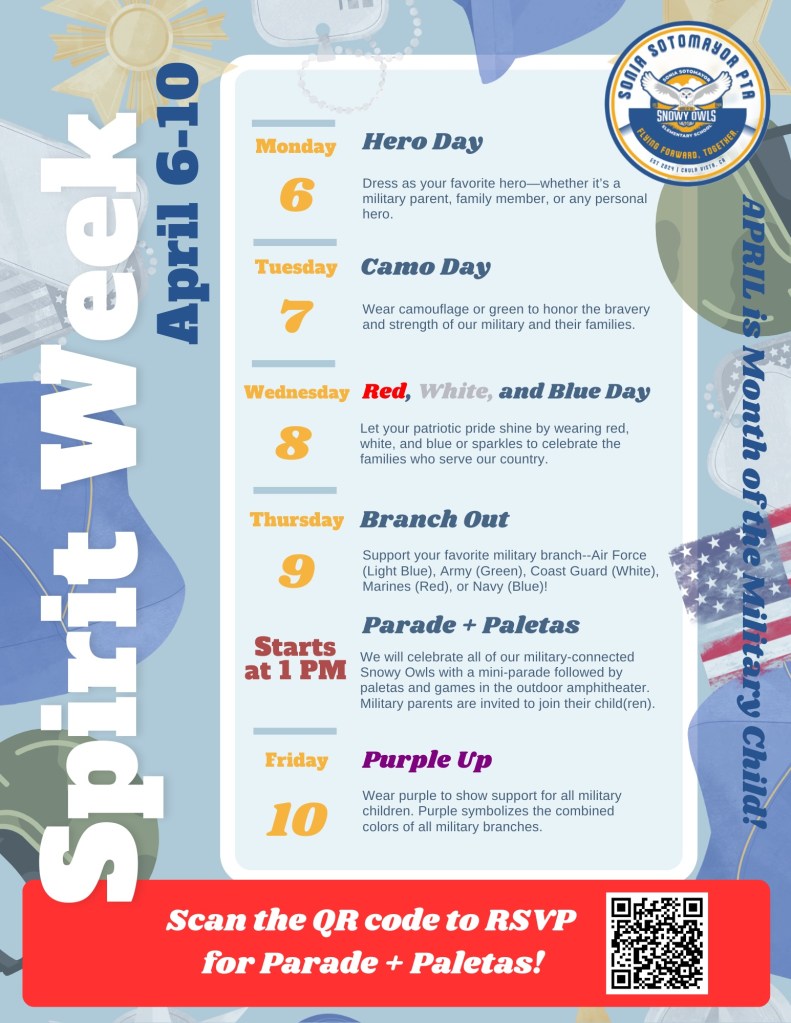 April is the month of the Military Child! At Sotomayor, we have over 90 military connected families. We salute them all! We are so grateful for their service and sacrifice. We will have a week of spirit days to honor and celebrate all our Military Families the week of April 6th. Thank for your service to our country!