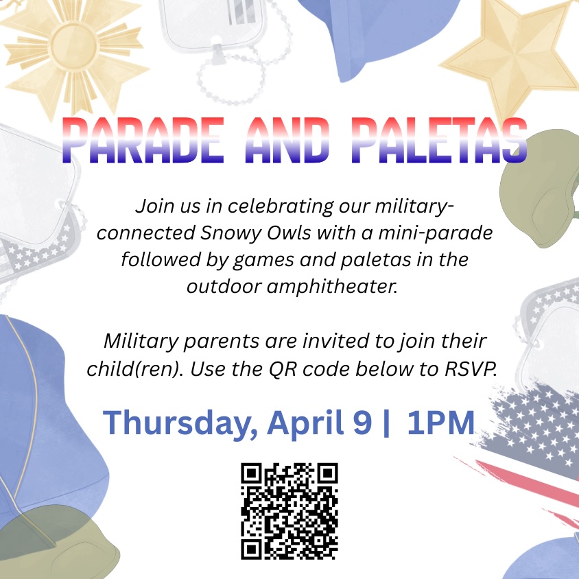Mark your calendars for Thursday, April 9th @ 1:00 PM. We will be hosting a parade and picnic for all our military families. We will have garden games and paletas for families to enjoy! Use the link below to RSVP for the event.